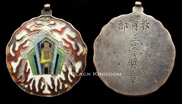 教育部奖章,银质,圆形,外缘赤金色火焰,中间蓝绿色山体,山体中间为象征教育的黄色“铎”型,铎上周易贲卦,艮上离下,艮为山,离为火,表示山火文明,化为天下之义也。教育部奖章以大小尺寸和绶带来区分等级,一等章6厘米,绶带黄色红缘;二等章5.3厘米,绶带蓝色红缘;三等章4.6厘米,绶带白色红缘;四等章4厘米,绶带绿色红缘。