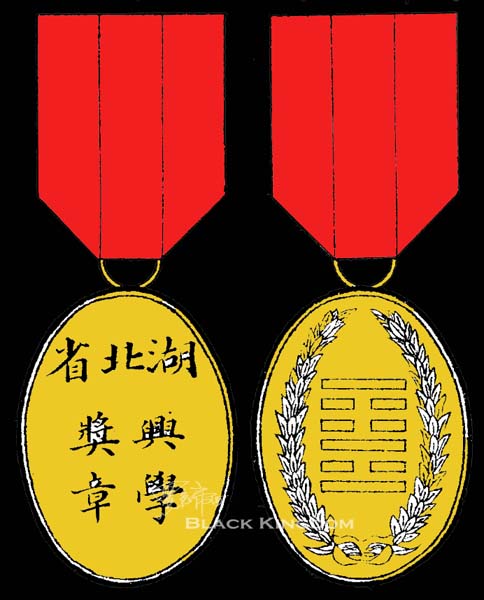 湖北省长兴学奖章,用银质椭圆形,直径均为营造尺一寸二分,奖章正面中列周易贲卦,贲卦艮上离下,兹取之以喻山火文明,化成天下之意,周环绕嘉禾表示国徽,背面文字“湖北省兴学奖章”,绶带金色奖章用红绶,银色奖章用黄绶,佩带於上衣左襟之上。