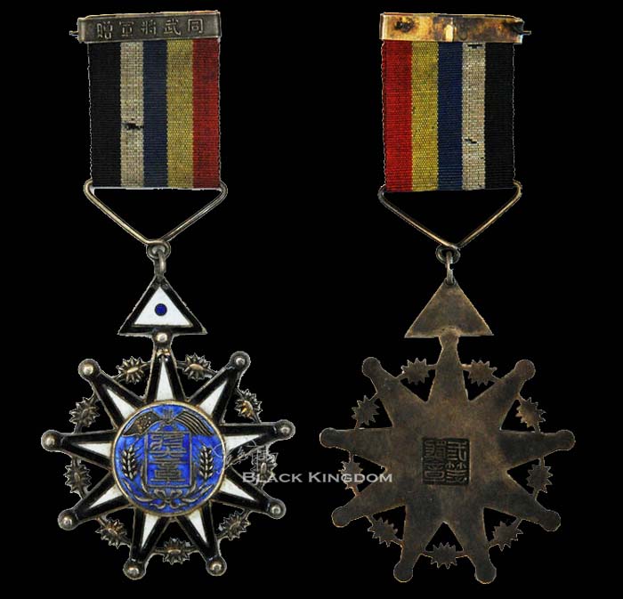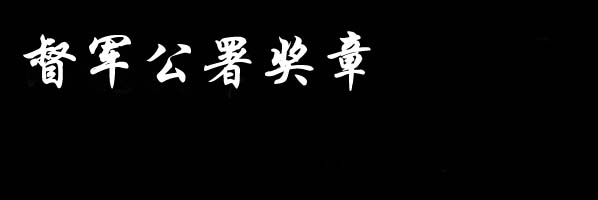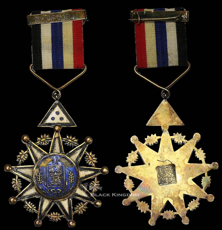 督军公署奖章,九角形,中间嘉禾和国旗、军旗图案,文字“奖章”,饰挂为黑边白底三角形,中间一等为三颗蓝色圆点,二等二颗,三等一颗。绶带为五色国旗,上有横条饰条,文字“山西督办公署”或“同武将军赠”。