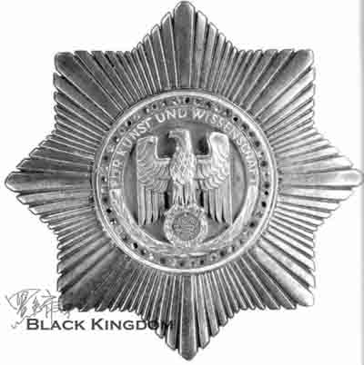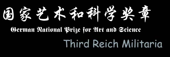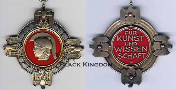 Nationalpreises für Kunst und Wissenschaft”。1937年1月30日,希特勒设立国家艺术和科学奖章,目的是阻止德国公民接受诺贝尔奖,用这个奖章来代替诺贝尔奖,作为和平时期最高级别的荣誉,与奖章一齐授予的还有10万帝国马克的免税奖金。第二次世界大战爆发后,这个奖章停止授予,传闻生产了10枚,仅仅有9名被授予这个声望很高奖章,使其成为第三帝国最稀有和最高级的奖章之一。奖章设计人Müller-Erfurt。