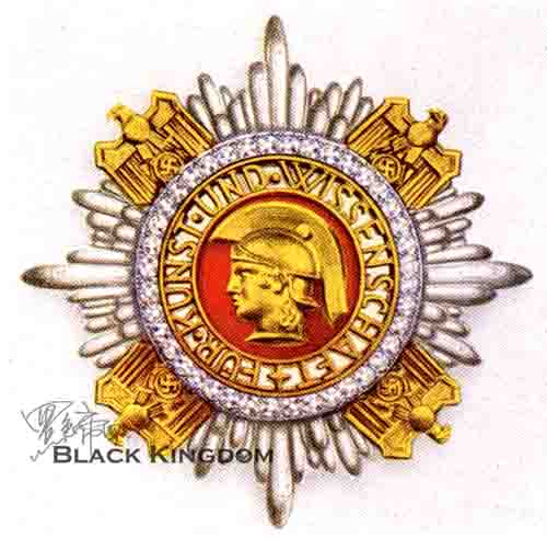 国家艺术和科学奖章是第三帝国最昂贵、最复杂的奖章,这个奖章由星形奖章和勋章绶带组成。星形奖章由钻石、白金和黄金制作,徽章直径95mm,四角上的鹰高20mm,宽21mm,重量大概210g。做工非常精制,经过抛光处理,金光灿灿,非常华丽。章体边缘是白金放射光芒,有四个主要放射条成十字形状,四个主要放射条之间有四个金制鹰徽和万字,章体中心是红底金制女神雅典娜侧像,头像外圈是黄金丝制作的文字“FüR.KUNST.UND.WISSENSCHAFT”,意思是“艺术和科学”,文字底是象牙白色珐琅,最下面正中是一个小四角星,文字环外面是一圈钻石,共镶嵌40颗。勋章绶带是宽105mm红色白边,上面有很多刺绣鹰徽和万字图案,在绶带交叉部位缝制一个金色丝线编制的圆环,圆环中间是红色丝线编制的鹰徽和黑色丝线万字。